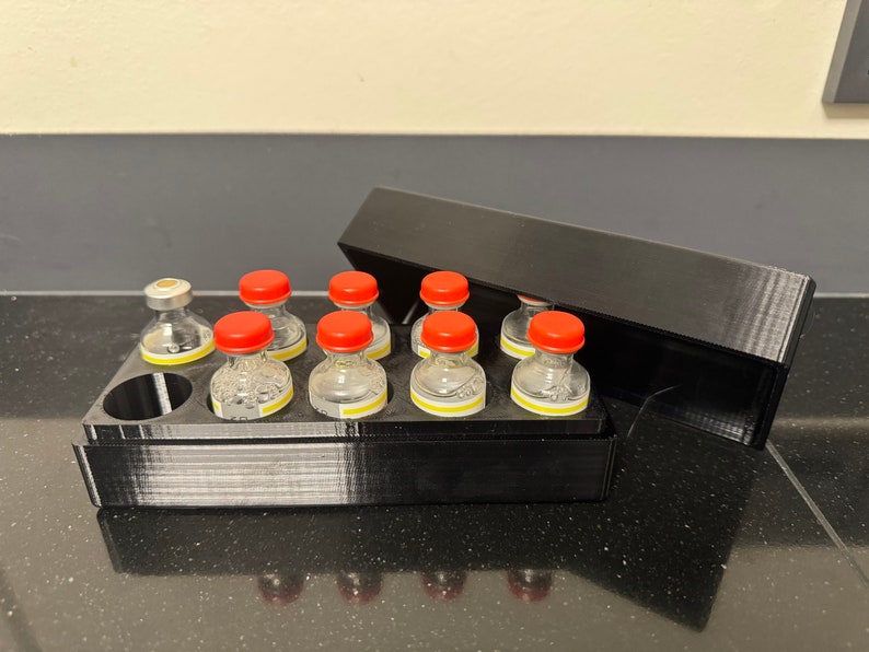 Dit artikel wordt met een 3D printer gemaakt, hierdoor kunnen er oneffenheden zichtbaar zijn. Flesjes insuline niet inbegrepen, deksel los bij te bestellen!